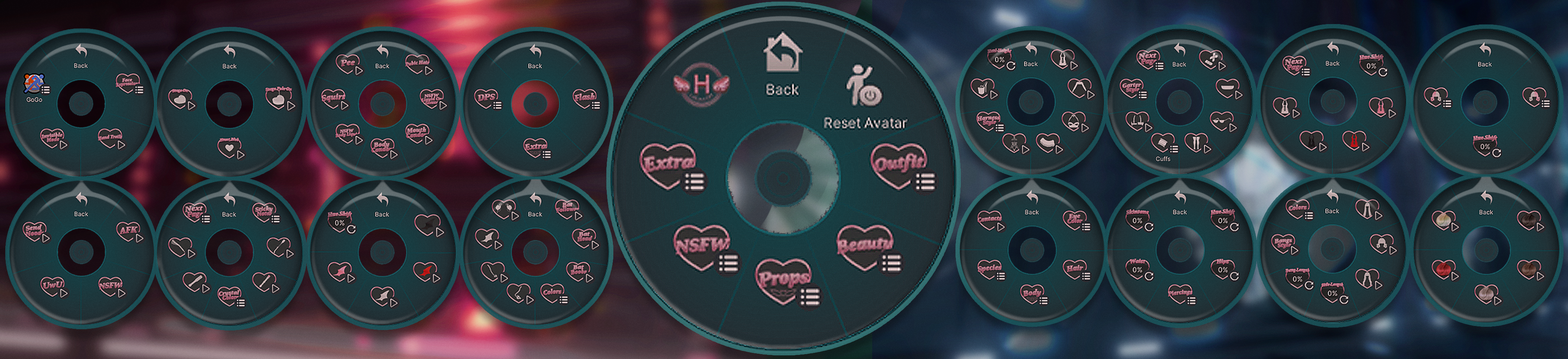 ♡ Hue Shifts, Radials, Hairstyles, Headpat and NSFW Particles, Bat Follower, Animated Turn Invisible option, Dissolving animations, Color Swaps, Toggable clothing, accessories, piercings, species, props and NSFW Options.